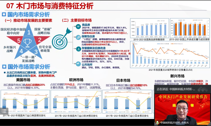 中國林產(chǎn)工業(yè)協(xié)會(huì)秘書長陳天全;中國林產(chǎn)工業(yè)協(xié)會(huì)副會(huì)長、北京綠林認(rèn)證有限公司總經(jīng)理吳盛富;國家林業(yè)和草原局產(chǎn)業(yè)發(fā)展規(guī)劃院工業(yè)工程一所所長、中國林產(chǎn)工業(yè)協(xié)會(huì)副秘書長張忠濤;中國林產(chǎn)工業(yè)協(xié)會(huì)木門窗產(chǎn)業(yè)分會(huì)執(zhí)行理事長、木門窗產(chǎn)業(yè)國家創(chuàng)新聯(lián)盟理事長張占寬;中國林產(chǎn)工業(yè)協(xié)會(huì)定制家居國家創(chuàng)新聯(lián)盟副秘書長熊先青;中國林產(chǎn)工業(yè)協(xié)會(huì)木門窗產(chǎn)業(yè)國家創(chuàng)新聯(lián)盟秘書長李偉光;北京優(yōu)品創(chuàng)想文化傳播有限公司總經(jīng)理劉怡春;中展智奧(北京)國際展覽有限公司副總經(jīng)理鄔成佳參加了本次線上會(huì)議,并做了主題分享。
