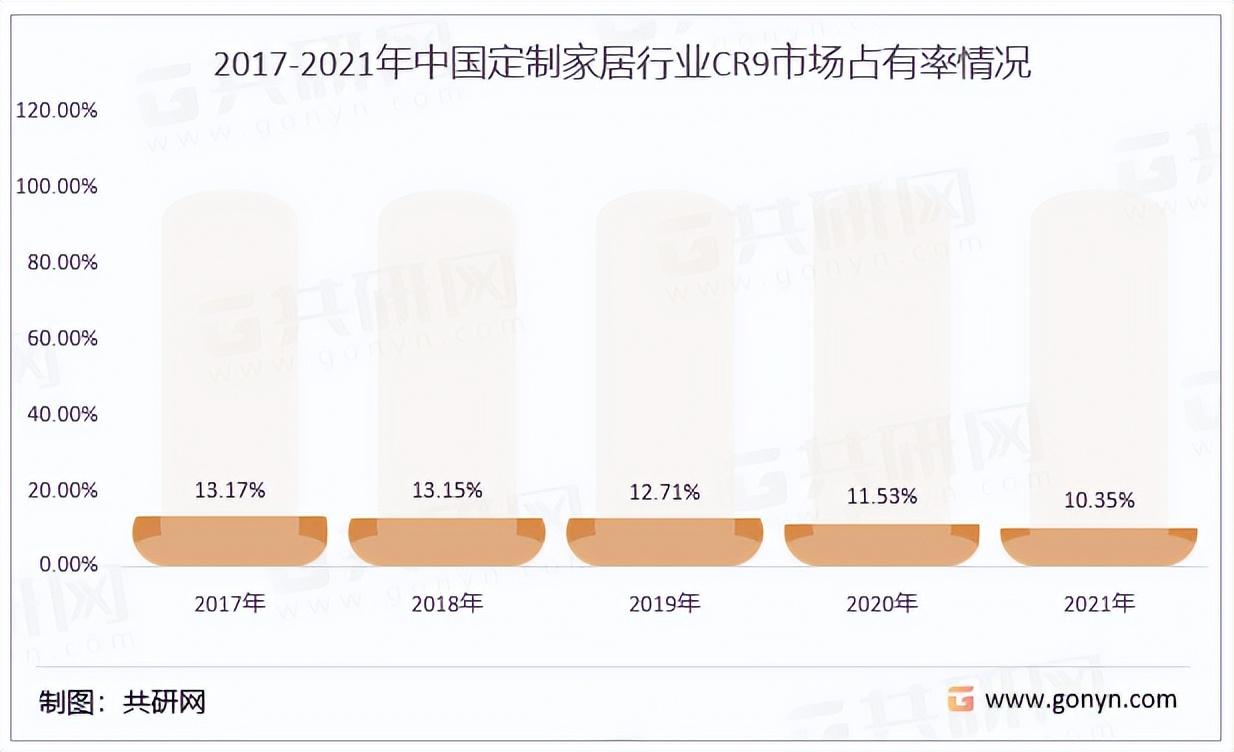 近年來,我國定制家居行業(yè)CR9市場占有率逐漸縮小,2017年我國定制家居行業(yè)CR9市場占有率為13.17%,2021年定制家居行業(yè)CR9市場占有率約10.35%左右。