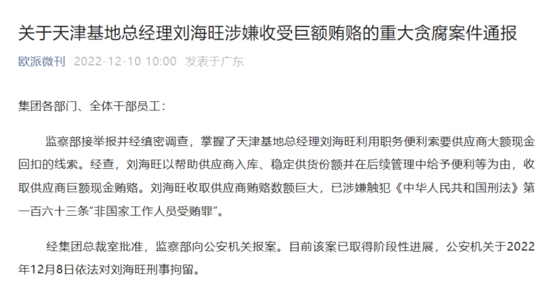 12月,歐派家居集團(tuán)發(fā)布通報(bào)顯示,天津基地總經(jīng)理劉海旺以幫助供應(yīng)商入庫、穩(wěn)定供貨份額并在后續(xù)管理中給予便利等為由,收取供應(yīng)商巨額現(xiàn)金賄賂,公安機(jī)關(guān)依法對(duì)劉海旺刑事拘留。