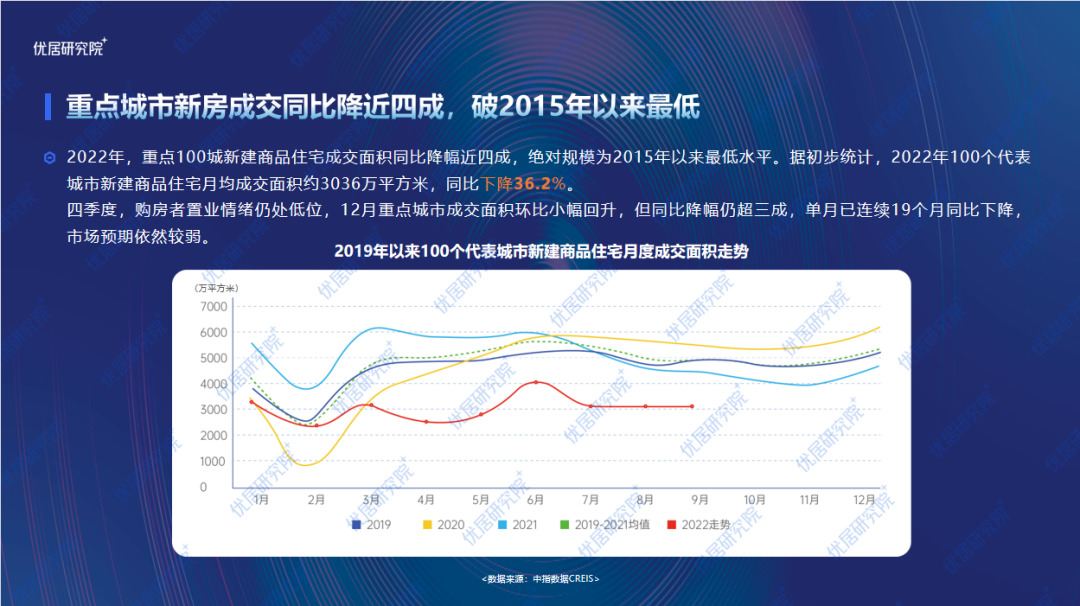 2022年,重點(diǎn)100城新建商品住宅成交面積同比降幅近四成,絕對規(guī)模為2015年以來最低水平。據(jù)初步統(tǒng)計(jì),2022年100個代表城市新建商品住宅月均成交面積約3036萬平方米,同比下降36.2%。