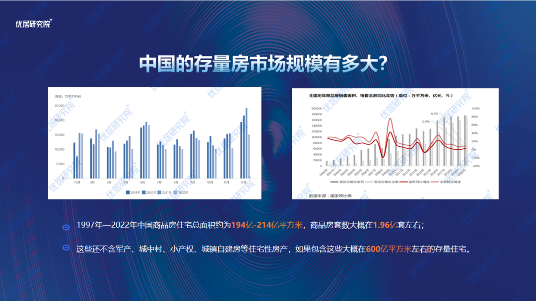中國的存量房市場規(guī)模有多大?1997年—2022年中國商品房住宅總面積約為194億-214億平方米,商品房套數(shù)大概在1.96億套左右;這些還不含軍產(chǎn)、城中村、小產(chǎn)權(quán)、城鎮(zhèn)自建房等住宅性房產(chǎn),如果包含這些大概在600億平方米左右的存量住宅。