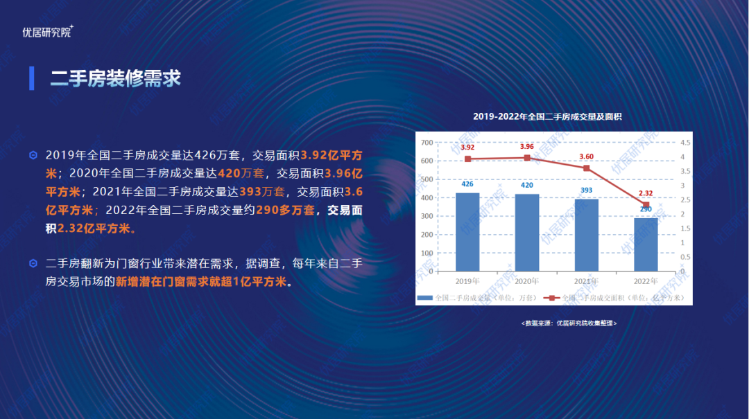 二手房翻新為門窗行業(yè)帶來潛在需求,據(jù)調(diào)查,每年來自二手房交易市場的新增潛在門窗需求就超1億平方米。