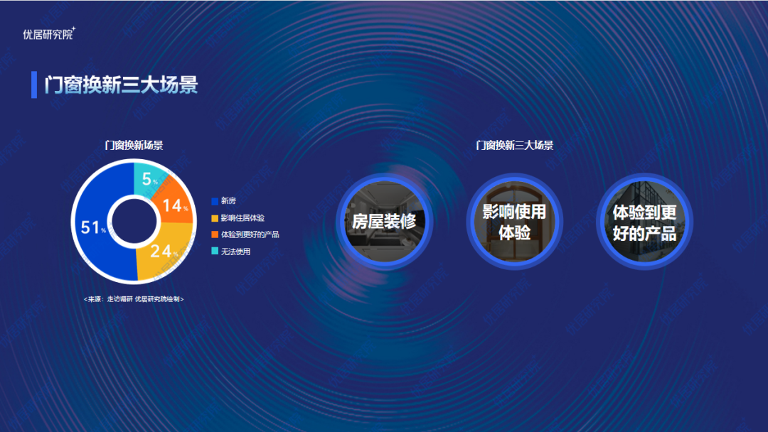當(dāng)前,門窗換新三大場景分別是房屋裝修、影響使用體驗(yàn)、體驗(yàn)到更好的產(chǎn)品。