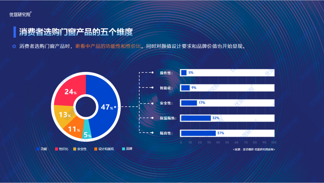 消費(fèi)者選購門窗產(chǎn)品時,更看中產(chǎn)品的功能性和性價(jià)比。同時對顏值設(shè)計(jì)要求和品牌價(jià)值也開始顯現(xiàn)。