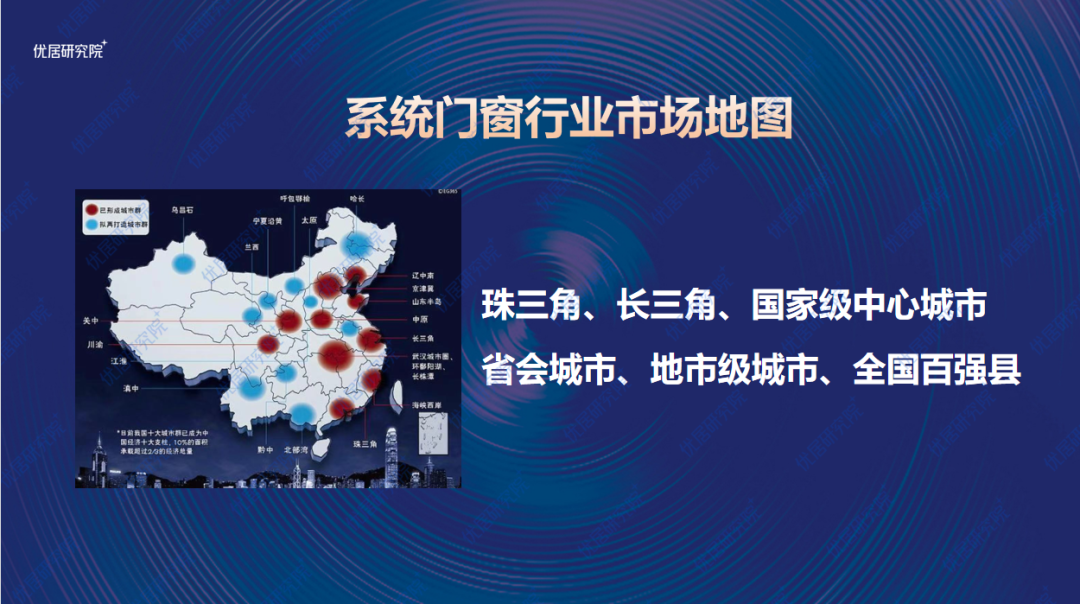當(dāng)下系統(tǒng)門窗行業(yè)市場主要分布在珠三角、長三角、國家級中心城市、省會城市、地市級城市、全國百強(qiáng)縣等。