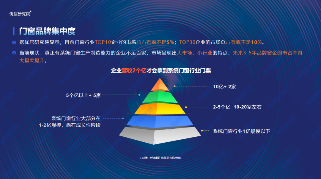 系統(tǒng)門窗行業(yè)當(dāng)前現(xiàn)狀:真正有系統(tǒng)門窗生產(chǎn)制造能力的企業(yè)不足百家,市場呈現(xiàn)出大市場、小行業(yè)的特點(diǎn),未來3-5年品牌窗企的市占率將大幅度提升。